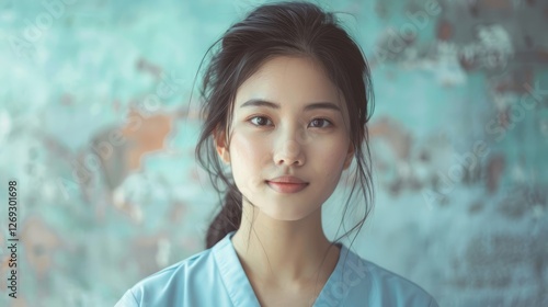 Young woman in medical scrubs smiling confidently in a softly lit, artistic background with textured walls