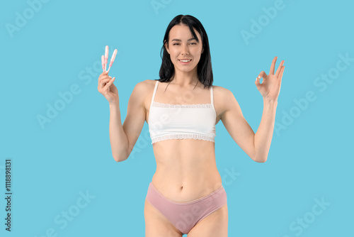 Young woman in menstrual panties with tampons showing OK on blue background
