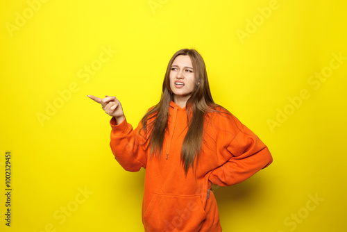 Young woman in orange hoodie on yellow background, surprised, pointing with hand.