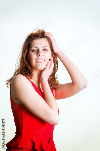 young woman in red dress on the pier