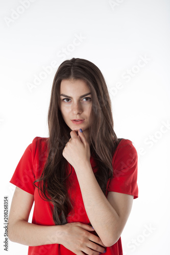 Young woman in red dress on white background.