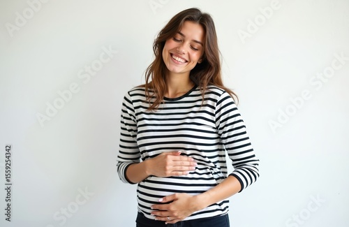 Young woman in striped t-shirt touches tummy, smiles gently. Beautiful female eats with satisfaction. Portrait on white background. Happy, joyful, smiling face, satisfaction. Pregnancy concept.