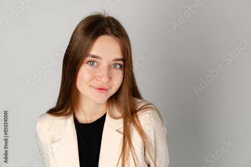Young Woman in White Jacket and Black Pants on Gray Background.