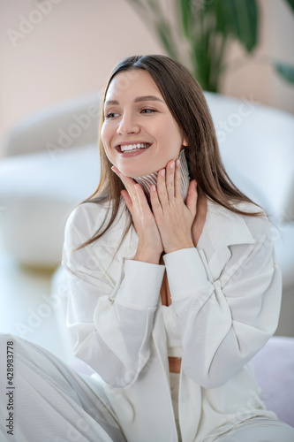 Young woman in white sitting in a room with tapes on her neck