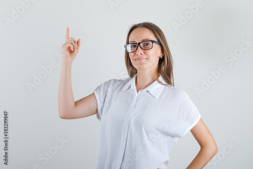 Young woman in white t-shirt pointing up finger and looking cheerful , front view.