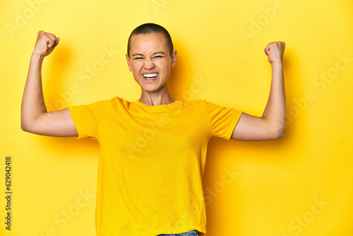 Young woman in yellow tee, yellow studio backdrop raising fist after a victory, winner concept.