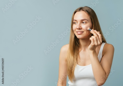 Young woman is applying makeup to her face with a brush, on a blue background