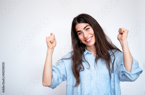 Young woman is celebrating success with arms raised and clenched fists