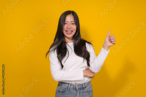 Young woman is smiling and giving a thumbs up gesture, expressing positivity and approval