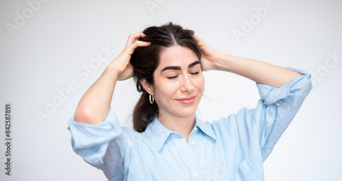 Young woman is touching her hair for a massage with a peaceful expression on her face