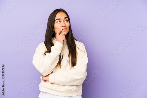 Young woman isolated on a purple background looking sideways with doubtful and skeptical expression.
