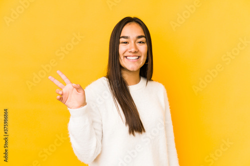 Young woman isolated on a yellow background joyful and carefree showing a peace symbol with fingers.