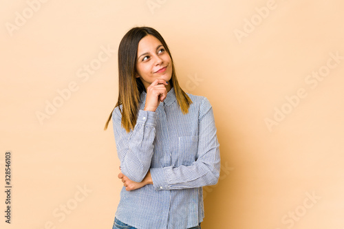 Young woman isolated on beige background looking sideways with doubtful and skeptical expression.