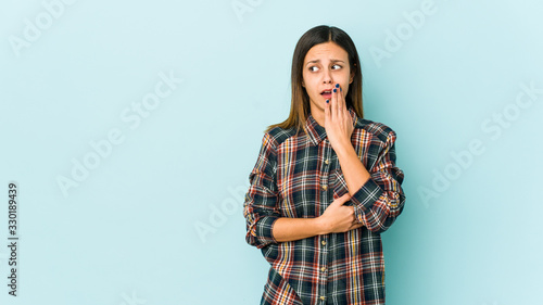 Young woman isolated on blue background yawning showing a tired gesture covering mouth with hand.