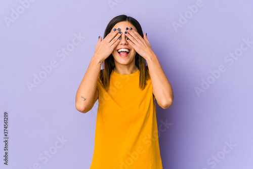 Young woman isolated on purple background covers eyes with hands, smiles broadly waiting for a surprise.