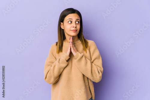 Young woman isolated on purple background praying, showing devotion, religious person looking for divine inspiration.