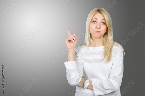 Young woman looking up and pointing at blank wall