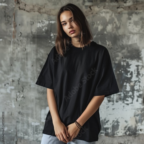 Young woman model dressed in black oversized tshirt, grunge background. Blank tee front view mockup. Youth girl short sleeve t-shirt design template. Crewneck tshirt mock up