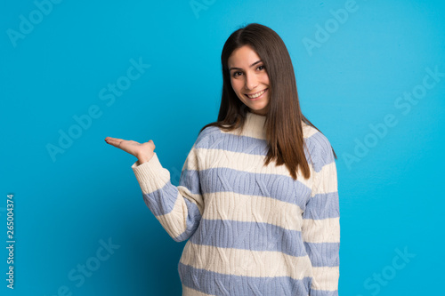 Young woman over blue wall holding copyspace imaginary on the palm to insert an ad