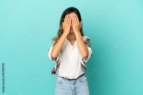 Young woman over isolated blue background covering eyes by hands