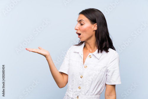 Young woman over isolated blue background holding copyspace imaginary on the palm