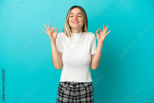 Young woman over isolated blue background in zen pose