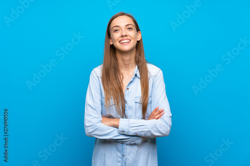 Young woman over isolated blue background keeping the arms crossed in frontal position