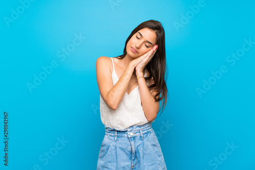 Young woman over isolated blue background making sleep gesture in dorable expression