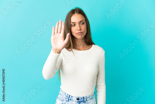 Young woman over isolated blue background making stop gesture and disappointed