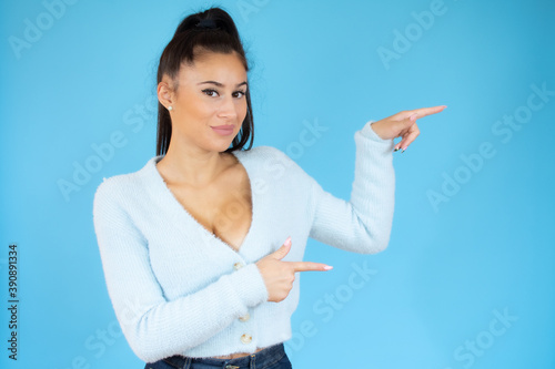 Young woman over isolated blue background pointing finger to the side