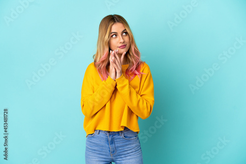 Young woman over isolated blue background scheming something