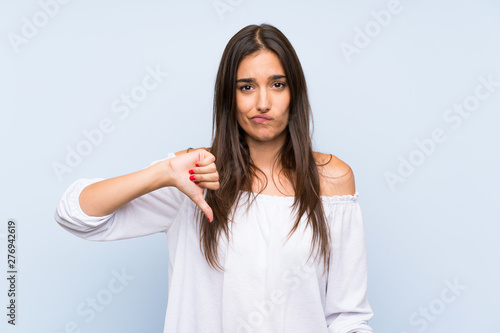 Young woman over isolated blue background showing thumb down sign