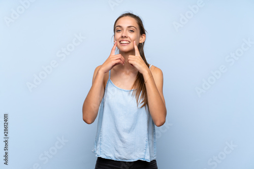 Young woman over isolated blue background smiling with a happy and pleasant expression