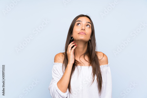 Young woman over isolated blue background thinking an idea