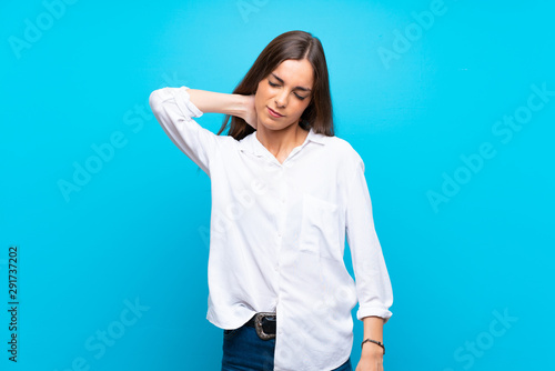 Young woman over isolated blue background with neckache