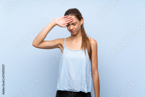 Young woman over isolated blue background with tired and sick expression