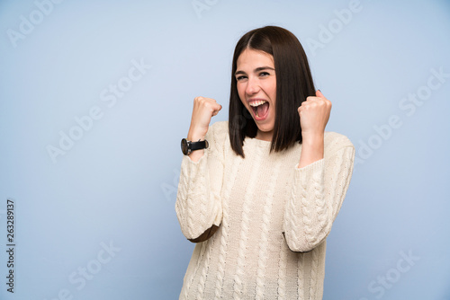 Young woman over isolated blue wall celebrating a victory
