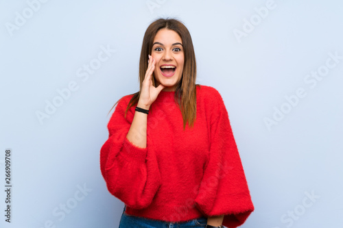 Young woman over isolated blue wall with surprise and shocked facial expression