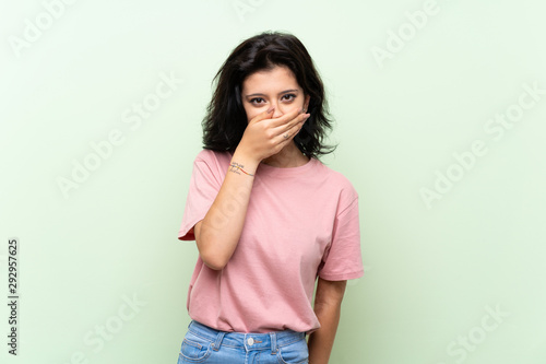 Young woman over isolated green background covering mouth with hands