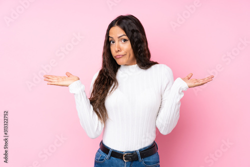 Young woman over isolated pink background having doubts while raising hands