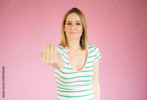 Young woman over isolated pink background inviting to come with hand. Happy that you came