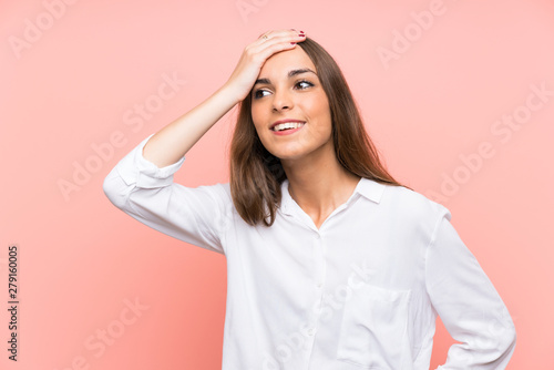 Young woman over isolated pink background laughing