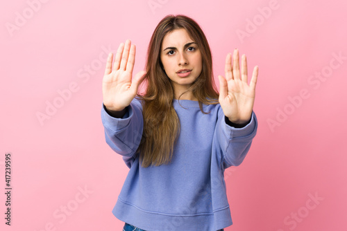 Young woman over isolated pink background making stop gesture and disappointed