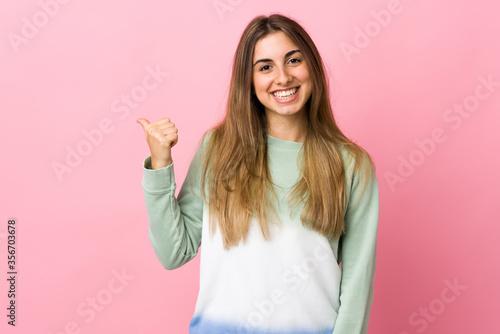 Young woman over isolated pink background pointing to the side to present a product