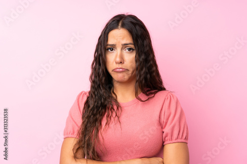 Young woman over isolated pink background sad