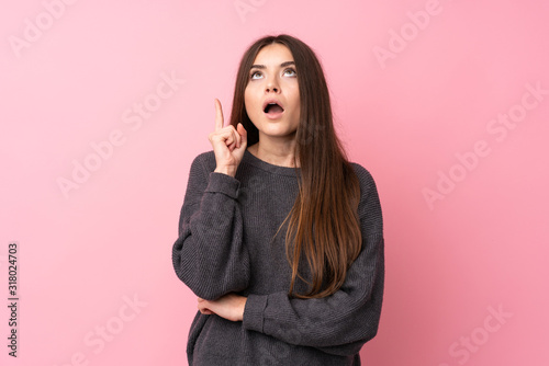 Young woman over isolated pink background thinking an idea pointing the finger up