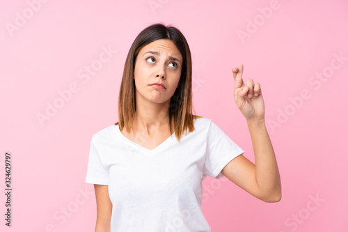 Young woman over isolated pink background with fingers crossing and wishing the best