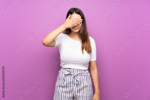 Young woman over isolated purple background covering eyes by hands. Do not want to see something