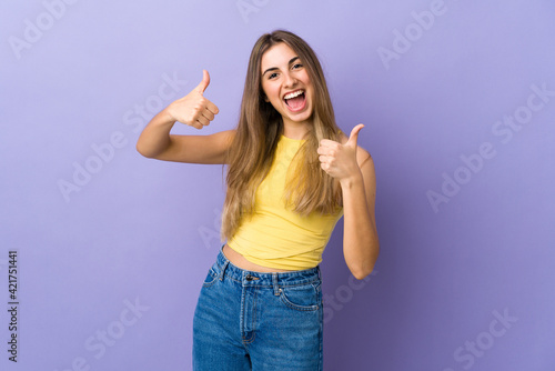 Young woman over isolated purple background giving a thumbs up gesture