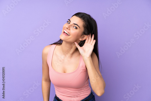 Young woman over isolated purple background listening to something by putting hand on the ear